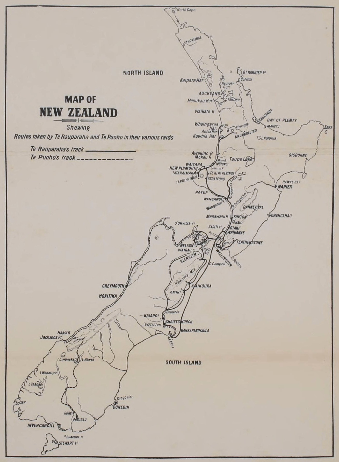 | MAP DELINEATING JOURNEYS OF TE RAUPARAHA AND TE PUOHO |