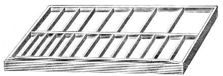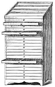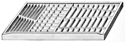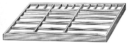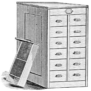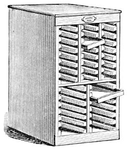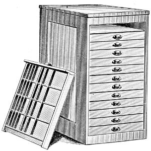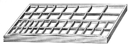 Sort-Case Cabinet.—Contains eight drawers, each divided into sixteen compartments. It will be found useful as a receptacle for quads, leaders or sorts.