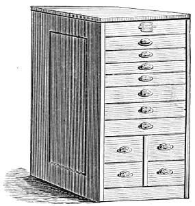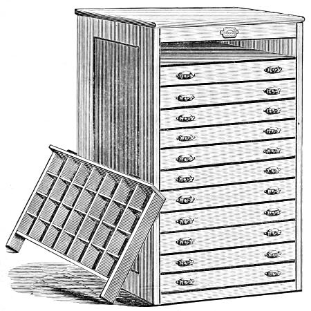 Handy Cabinet.—Contains five drawers, arranged to hold twenty different sizes of spaces and quads, and eight blank drawers, for cuts or large type.
