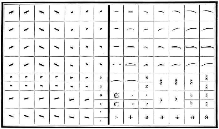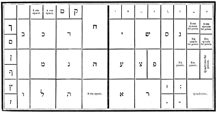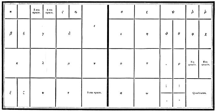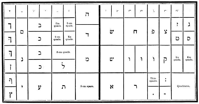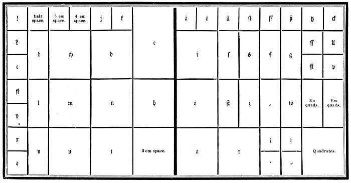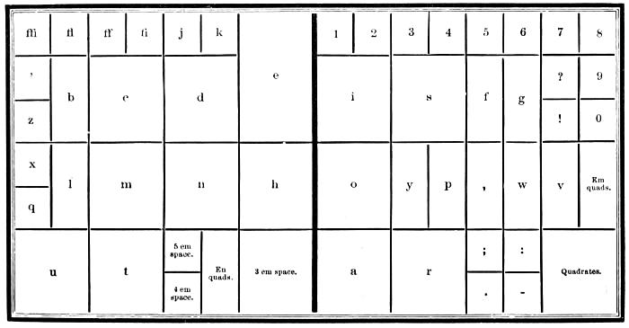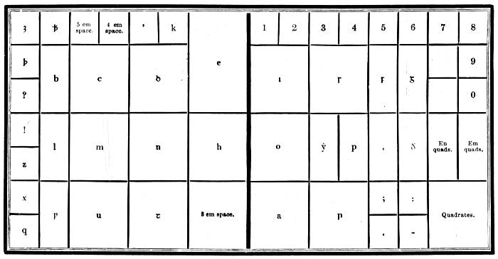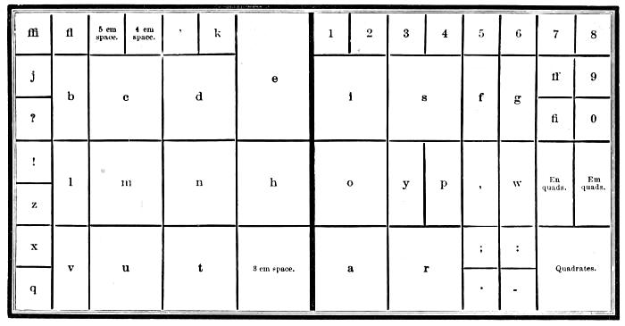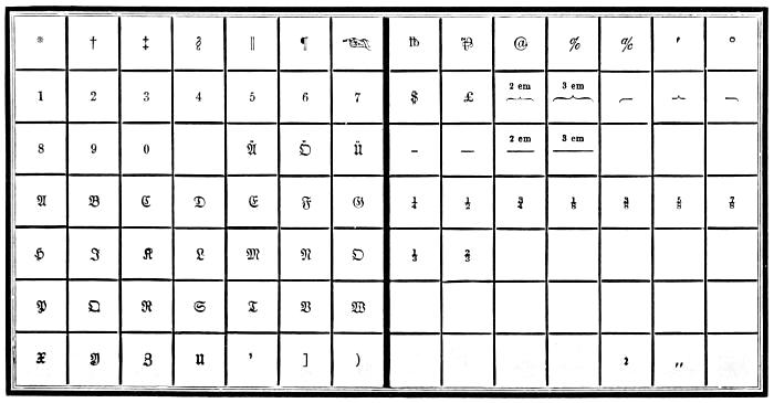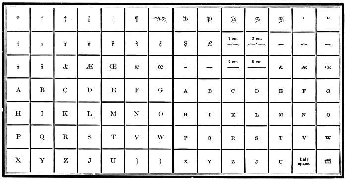 | Types—Roman letter—Italic—Black—Anglo-Saxon—Names and sizes of type—Gradations of type—Point System of Type bodies—A Bill of Pica—A Fount of type—Capitals—Small capitals—Points—Apostrophe—Hyphen—Parenthesis and Bracket—References—Accents—Numerals—Arabic figures—Old-style figures—Cancelled figures—Fractions—Signs—Metal rules or dashes—Braces—Spaces—Two-line letters—Quadrates—Quotations—Labour-saving quotation furniture—Hollow quadrates—Circular quadrates—Labour-saving curvatures—Leads—Flowers and borders—Brass rule—Brass labour-saving rule—Improved labour-saving rule case—Earliest written sounds—Hieroglyphic alphabet—Runic alphabets—Anglo-Saxon alphabet and plan of cases—German alphabet and plan of cases—Greek alphabet and plan of cases—Hebrew alphabet and plan of cases—Russian alphabet—Comparative table of bodies of Music type—Music composition—Music cases—Modern conveniences. | |