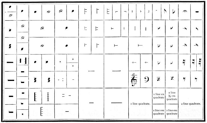 Music Type without an equal in America, or a superior in the world. The sizes are Excelsior, or half-Nonpareil, Diamond, Agate, and Nonpareil. Greek and Hebrew of all practical sizes.