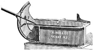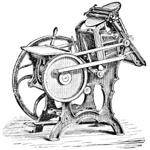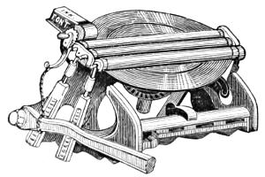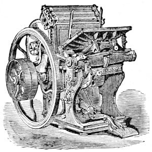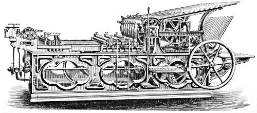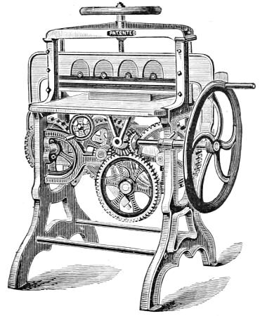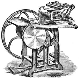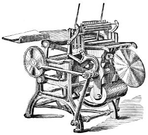 Matthew Smith, a man of uncommon ability and business talents, died in 1842. The business was then continued by Richard M. Hoe, with his two brothers, Robert Hoe and Peter Smith Hoe,—the eldest, as before, taking charge of the mechanical department, in which his industry and fertility of invention are attested by the number and value of his patents. In 1837, he patented here and in England his method of grinding circular saws, by which the thickness of any part of a saw can be regulated with accuracy. In 1846, he brought out the so-called “Lightning Press,” or Type-Revolving Printing Machine, described in the text,—the greatest innovation on the routine of the printing craft since the days of Gutenberg. This press entirely superseded all others for fast printing, and was introduced into the principal offices, not only in this country, but in England, Scotland, Ireland, and Australia.