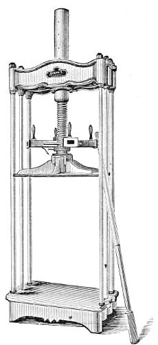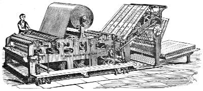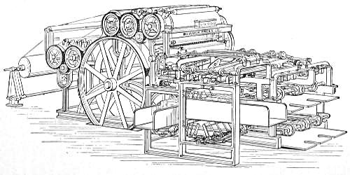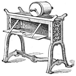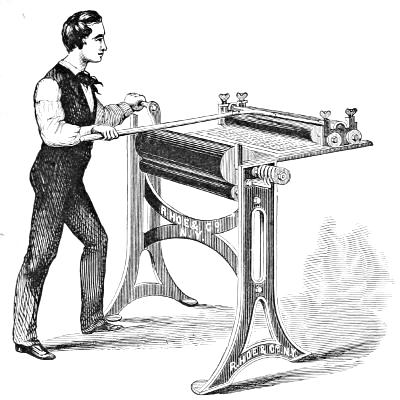 [18] While publisher of a paper in Catskill, he produced within a week, aided by some village mechanics, a press for his own use. With the exception of a stone bed, the principal parts were made entirely of wood. It was a flat-bed press, having a series of impression cylinders connected by an endless chain, by means of which they passed over and around the bed continually. He called it the Chain-running Press. It was employed by Frank Leslie to print an edition of his Illustrated Newspaper.