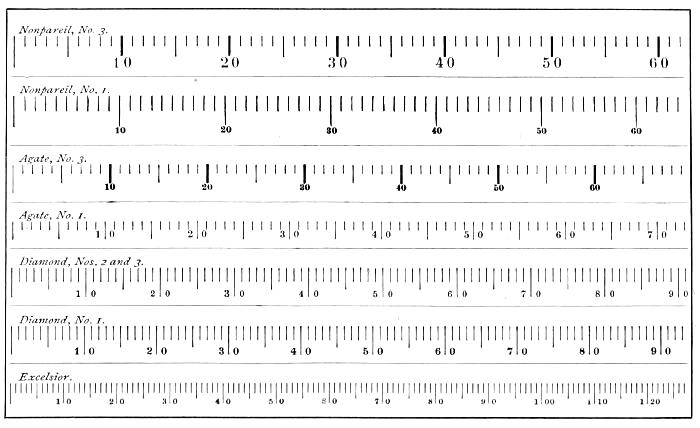 (Matching our standard type bodies,) Single, Double, Parallel, Dotted, and Triple faces. Cut accurately of various lengths. It will be found of vast utility in tabular and job work, rendering the use of shears and file entirely unnecessary. Cases furnished specially adapted to it.