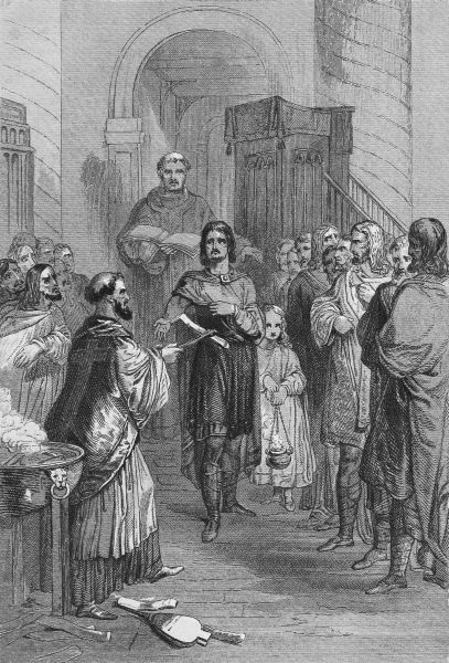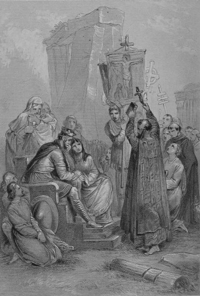 | Commencement of the civil war amongst the Saxons—Struggle between Ethelbert, king of Kent, and Ceawlin, king of Wessex, for the title of Bretwalda—Description of the slave-market of Rome—Monk Gregory's admiration of the British captives—Gregory becomes pontiff, and despatches Augustin with fifty monks to convert the inhabitants of Britain—Picturesque description of the landing of the Christian missionaries in the Isle of Thanet—Intercession of Bertha—Ethelbert's interview with Augustin and his followers—The missionaries take up their residence in Canterbury—Conversion of Ethelbert—Augustin is made Archbishop, by Pope Gregory—The rich presents sent to Britain by the Pope—Character of the Roman pontiff—His wise policy in not abolishing at once all outward forms of heathen worship—Eadbald ascends the throne of Kent—Marries his stepmother, and is denounced by the priests—He renounces the Christian faith—The monks are driven out of Essex—Eadbald again acknowledges the true faith, and the persecuted priests find shelter in the kingdom of Kent | p. 99 |