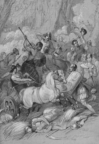 | Cæsar's reasons for invading Britain—Despatches Volusenus from Gaul to ivreconnoitre the island—Is intimidated by the force he finds arranged along the cliffs of Dover—Lands near Sandwich—Courage of the Roman Standard-bearer—Combat between the Britons and Romans—Defeat and submission of the Britons—Wreck of the Roman galleys—Perilous position of the invaders—Roman soldiers attacked in a corn-field, rescued by the arrival of their general—Britons attack the Roman encampment, are again defeated, and pursued by the Roman cavalry—Cæsar's hasty departure from Britain—Return of the Romans at spring—Description of their armed galleys—Determination of Cæsar to conquer Britain—Picturesque description of the night march of the Roman legions into Kent—Battle beside a river—Difficulties the Romans encounter in their marches through the ancient British forests—Cæsar's hasty retreat to his encampment—The Roman galleys again wrecked—Cessation of hostilities—Cassivellaunus assumes the command of the Britons—His skill as a general—Obtains an advantage over the Romans with his war-chariots—Attacks the Roman encampment by night and slays the outer guard—Defeats the two cohorts that advance to their rescue, and slays a Roman tribune—Renewal of the battle on the following day—Cæsar compelled to call in the foragers to strengthen his army—Splendid charge of the Roman cavalry—Overthrow and retreat of the Britons—Cæsar marches through Kent and Surrey in pursuit of the British army—Crosses the Thames near Chertsey—Retreat of the British general—Cuts off the supplies of the Romans, and harasses the army with his war-chariots—Stratagems adopted by the Britons—Cassivellaunus betrayed by his countrymen—His fortress attacked in the forest—Contemplates the destruction of the Roman fleet—Attack of the Kentish men on the encampment of the invaders—The Romans again victorious—Cassivellaunus sues for peace—Final departure of Cæsar from Britain | p. 30 |