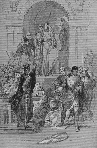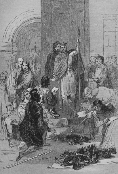 There were two other forms of ordeal, called the cross and the corsned; the former consisted of two pieces of wood, which were covered over, one bearing the mark of the cross; if the accused drew this, he was considered innocent; if the piece that was unmarked, guilty. The other consisted in swallowing a piece of bread which the priest had blessed; if it stuck in the throat, or the culprit turned pale, or trembled, or had a difficulty in swallowing it, he stood condemned. Besides fines, many of the punishments they inflicted were severe; they used the whip and the heated brand, mutilated the face, imprisoned, banished, sentenced the guilty to slavery, or doomed them to suffer imprisonment, while their capital punishments appear to have been hanging and stoning to death. The land was divided into what was called "folkland" and "bocland." The folkland was such as belonged to the king and the people; that which was held by agreement or charter was called "bocland," or land made over by agreement of the book, or some written instrument, though conveyances of land were sometimes made by the delivery of an arrow, a spear, or any other object. The king had, however, his bocland or private property, as is proved by the will of king Alfred; and the word folkland in time was changed to crownland, which, no doubt, means that the wastes and commons which the people were allowed to make use of, and were not private property, were considered to belong to the king or the state. Boclands appear originally only to have been granted during the life of the holder. It was the work of time and the change of events which caused them to become hereditary. The Saxons were divided into many classes or ranks; first stood the king, then the earls, nobles, or chiefs; then came the other class of small landed proprietors; and below these another grade, whom we may term freemen; the theows, ceorls, or villains, came last, and were slaves of the soil; if the estate changed hands, the theow went to the next owner; on no account could he remove348 from the land; he was, however, protected, and, so long as he did his duty, could not be removed by the owner; neither could more than a regular portion of labour be exacted from him; but we have before alluded to his privileges in the laws of Ina. The ceremonies used at their witenagemotes, guilds, moots, and other courts, are matters of law rather than subjects suited to a narrative and picturesque history of England.