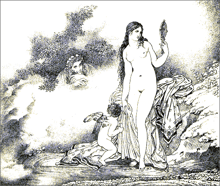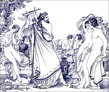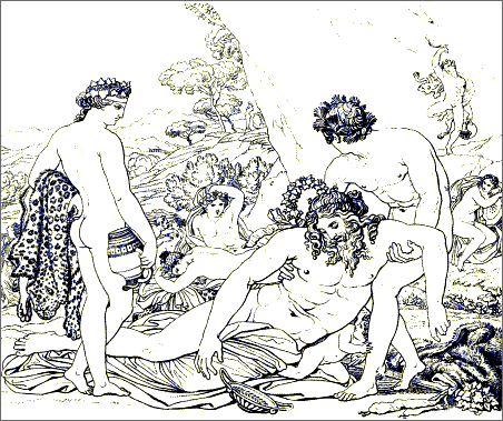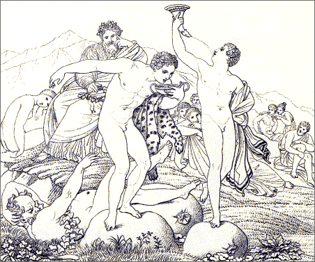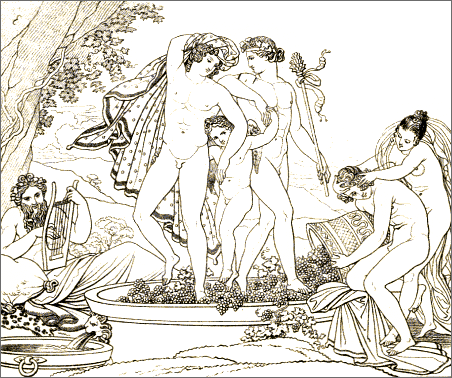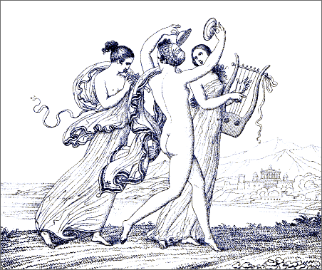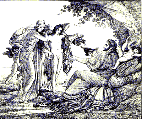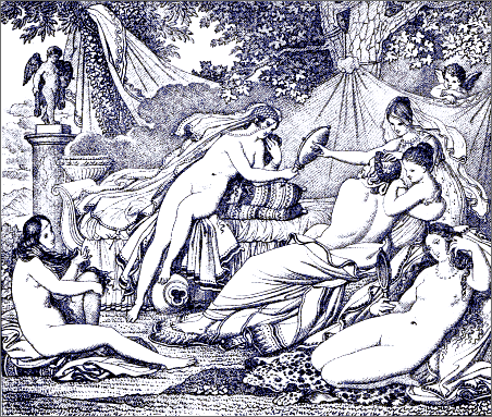 Seldom indeed have chasteness of execution and voluptuousness of character been so curiously and indissolubly blended. Seldom has a modern artist so happily caught the spirit of an ancient poet. We seem to [Pg 8]be transported, as in a dream, to the vines, and orange-groves, and cloudless skies of Greece, and the wearied spirit abandons itself for a while to the soft influences of the azure heaven, the countless luxuriance of roses, the undulating forms of the fair girls dancing in the shade, while youthful attendants brim the beaker with wine. Under such influences we remember that youth, and love, and mirth are immortal, and we say with Horace,—