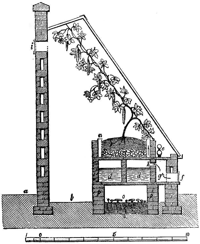 A reference to the sketch, will at once shew the general nature of the internal arrangements. There should be a tank (d) supported by brick piers (p) in which a circulation of heated water would supply a genial warmth to the soil above, and to the roots of the plants growing in the soil; this tank should be heated by a small boiler, conveniently placed with reference to adjacent arrangements; a series of iron pipes (e) attached to the same boiler, would supply the requisite heat to the atmosphere. It may perhaps be thought that the application of the gutter system of heating would in this case be preferable; but as there would be a perfect command of moisture, as will be explained further on, it is desirable to have dry heat also, under controul, and this can be better effected by means of the pipes than by adopting the gutter plan of heating. I cannot in this place forbear protesting against the limited surface of piping generally employed in heating plant structures; what is thought to be just[Pg 20] enough to maintain a given temperature, is usually after minute calculation, the quantity which is made use of, and the consequence is, that under adverse circumstances, the apparatus is necessarily worked at its highest pitch; and I believe that the application of heat in this form, whether it be by means of an hot water apparatus, or by a common flue, is most inimical to the plants submitted thereto. The admission of air, is a point which as far as I am aware, has never been effected in the manner represented in the sketch: it would be thus effected;—a series of apertures (f) should be provided at intervals along the front wall, which would externally be closed by small sliding shutters, and would communicate internally with a chamber (g) formed between the front wall and the side of the tank; this chamber would also communicate, by a series of openings, (h) with the interior space above the water in the tank, and from this space, through the covering of the tank, tubes (m), also placed at intervals, would be carried up through the soil, close to the side of the wall; these tubes should be furnished with caps or valves, so as so admit of the communication being stopped at any time. In applying this to the admission of air, we must not loose sight of a series of ventilators, (i), placed in the back wall of the house, which are of precisely the same nature and construction as the apertures (f), already spoken of. I shall have occasion hereafter, to notice the admission of air, but it will be well in this place, to explain the action of the plan proposed for that purpose: when it is judged that a change of the internal volume of air is requisite, the ventilators (i) are to be opened, which admits of a portion of the rarified air to pass off; the ventilators (f) are also to be opened, and by means of the action of these ventilators on each other, a portion of external air is taken in; this enters the chamber (g), which is warmed by its contiguity to the tank, and here becomes partially rarified, and rises to the[Pg 21] top of the chamber; the apertures (h) admit it to the interior of the tank, where it becomes not only thoroughly warmed, but also imbibes a degree of moisture proportionate to the degree in which it becomes heated, and thence it enters the house by the tubes or shafts already spoken of. The advantages of warming and moistening the air thus admitted, are very important ones; for when either a cold or dry state, of the atmosphere prevails, its influence is very injurious to plants in these confined situations: cold raw air, when it comes in contact with the tender foliage of the plants, has the effect of chilling the sap in its progress through their tissue, and thus lessening their excitability, when it should be increased; whilst dry air acts as an incessant drain upon the vegetable juices, which it abstracts through the stomates and pores of the leaves and stems. When cold air is admitted to any position where it can unite with caloric, and not in an equal ratio with moisture, it necessarily becomes arid, and in that state it eagerly combines with moisture in any form with which it can come in contact therewith; and consequently if cold air is admitted to a plant structure, where it can have the means of combining with heat, faster than with moisture, it would be brought into this arid state, and would supply its voracious appetite, by abstracting the juices of the plant. It is a very important question how far this state of things is connected with many of the diseases as they are called, to which plants are subject; for my own part, I believe it to have a very considerable influence in the production of many of them. A shallow bed of soil (k), is all that would be required; for in the winter season, there is nothing gained by encouraging a very luxuriant and gross state of growth: the composition of this soil will be noticed hereafter: beneath it, and resting on the top of the tank, should be placed a layer of coarse open rubble, not less than six inches in thickness; and among this rubble[Pg 22] by means of tubes (n), placed at intervals along the bed, I would occasionally pour considerable quantities of water, in order to maintain a due regulation of moisture in, and throughout the soil, among which the vapour arising from the water would ultimately rise. Beneath the tank a space (o), might be provided, which would serve admirably either for the cultivation of Mushrooms, or the forcing of Rhubarb, or Sea Kale. Transverse partitions should be introduced into the bed of soil, so as to divide the roots of each plant from those of its neighbours: this arrangement will admit of a complete succession of plants being maintained, by the removal of those which have become old and debilitated, and the substitution of young and vigorous ones; and this obstruction of the roots, will not be injurious, for the Cucumber does not by any means require to be permitted to extend its roots