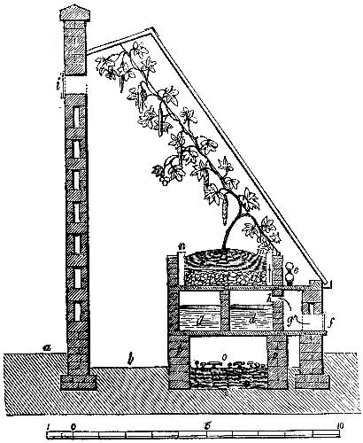 The importance of bottom heat in the culture of tender plants, being a practical fact established beyond question, another consideration arises as to the best means of producing it, and of regulating its application. Various substances and materials have been submitted to a process of fermentation, and so employed to effect it: stable manure, tanner’s bark, and the leaves of trees, are among the principal of these materials, and either of them will supply just what the plants require, as truly as these wants can be supplied by any other means; but from their very nature, they are violent, and fluctuating, and ephemeral in their action, and setting aside the labour which the employment of them necessarily involves, we have in these particulars, the special points in which the tank system of applying bottom heat far excels them: it is uniform, and constant, in its action; there need be no apprehension of the soil becoming overheated, for the source whence it derives its warmth ought never to[Pg 16] boil; neither need there be any fear of its decline, or of a want of power, for when once thoroughly heated, a body of water will part with it in such a manner, that a very little attention to the fire, and a very little expenditure of fuel, will maintain its temperature for an almost incredible length of time; and as to power, it never should for a moment form a question, because a powerful degree of bottom heat ought never to be applied: a close attention for one or two hours during the twenty four which form a day, will maintain any apparatus in an effective state of action, if it is properly erected. How different is this, to what has been in days now past! when in rigorous weather, with the heat of his dung bed declining, the cultivator knew that at the peril of his crop, he scarcely dared to attempt to revive it, without involving a more serious because an accelerated evil; at any rate, if at an immense sacrifice of labour, his dung casings were replenished piece by piece, he knew too well, that often many days would elapse, before their action would be efficient and satisfactory, unless indeed an unlimited supply of materials, were in a constant state of preparation. By means of the tank, a fire could be lighted up, and the required effect produced in as many hours, as days would have been formerly required.
