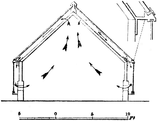 The angle of elevation is not, as it is sometimes asserted to be, a point of indifference, though mathematical accuracy is certainly by no means required: in the annexed engraving, the angle of the roof is about 55°, this provides for the admission of the sun’s rays in the winter months, when his position is comparatively low in the horizon, to a much greater extent than could take place if a more ordinary slope were adopted. A still more elevated pitch would doubtless effect this object in a still more perfect manner; but would not be equally applicable to the requirements from a permanent structure, which would be wanted for summer as well as winter use.
