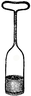 I have, at p. 26, given what appear to me to be some of the principal reasons against the practice of transplanting, or planting out, Cucumber and other plants. When this is done after any quantity of roots are produced, some injury or check must be sustained during the process; and checks of this kind are opposed to the realisation of the greatest results within the shortest period, which of course is the great object in view. Where it is inconvenient to plant the seeds in the places the plants are intended to occupy, or to put out the young plants during the earliest period of their development, or where propagation by cuttings or layers, is adopted, and the plants of course have to be potted separately, so as to be in a removable state,[Pg 68] the following simple plan may be adopted, and will be found to combine all the advantages and conveniences attending the use of pots, with the avoidance of the evils of transplantation, &c. The plan referred to, consists in the employment of turf or peat, so contrived as to supply the place of pots, and which of course at the time of planting is simply placed, along with the plant it contains, at once into the soil, without in the least disturbing the roots, which, growing through the substance of the turf, extend beyond it in all directions into the free soil provided for them. These turf pots are made of spongy, fibrous turf—whether loamy or peaty is not material, provided it is full of fibre, so as to admit of being readily traversed by the roots. The grassy surface is evenly removed, and the under-turves are cut three or four inches in thickness, and are then divided into squares of about three inches across. The centre of each of these little squares is taken out by means of an iron scoop, such as that represented in the annexed sketch; and this is then filled up with soil, and the plant, or seed, or cutting, or layer, inserted as if it were into an ordinary flower pot. It will be obvious that by this plan, every plant is independent and perfectly removable—thus securing the convenience of sowing or planting and rearing the plants in pots during their earliest stages: on the other hand, at the time of planting out permanently, the plant, turf, and all being set carefully into the soil, no check is sustained, because the roots remain undisturbed, and may, as they advance, penetrate through the turf into the prepared soil which surrounds them; in this way the advantages of sowing[Pg 69] or planting at the very first in the position the plants are intended to occupy permanently, are secured.