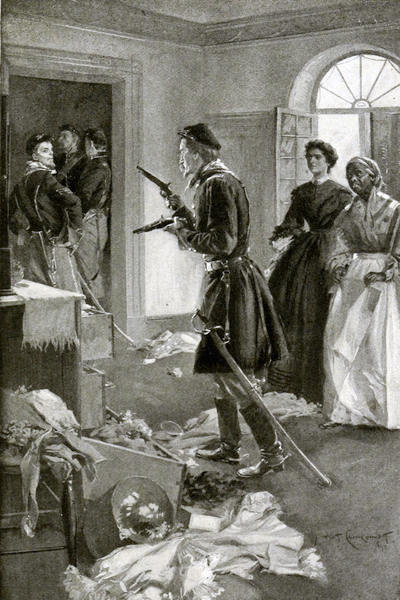 Steve Allen, who was always a reckless talker, however, used to say that the stain was nothing but a bit of red sandstone which had outcropped at the point where that huge fragment was broken off, and rolled along by a glacier thousands of years ago, far to the northward; but this view was to the other children’s minds clearly untenable; for there never could have been any glacier there—glaciers, as they knew from their geographies, being confined to Switzerland, and the world having been created only six thousand years ago. The children were well grounded by their mothers and Miss Thomasia in Bible history. Besides, there was the picture of the “Indian-killer,” in the black frame nailed in the wall over the fireplace in the great hall, and one could not go anywhere in the hall without his fierce eyes following you with a look so intent and piercing that Mammy Celia was wont to use it half jestingly as a threat effectual with little Jacquelin when he was refractory—that if he did not mind, the “Indian-killer” would see him and come after him. How often Mammy Celia employed it with Jacquelin, and how severe she used to be with tall, reckless Steve, because he scoffed at the story, and to tease her, threatened, with appropriate gesture, to knock the picture out of the frame, and see what was in the secret cabinet behind it! What would have happened had Steve carried out his threat, Jacquelin, as a boy, quite trembled to think; for though he admired Steve, his cousin, above all other mortals, as any small boy admires one several years his senior, who can ride wild horses and do things he cannot do, this would have been to engage in a contest with something supernatural and not mortal. Still he used to urge Steve to do it, with a certain fascinating apprehensiveness that made the chills creep up and down his back. Besides, it would have been very interesting to know whether the Indian’s scalp was still in the hollow space behind the picture, and if so, whether it was still bleeding, and that red stain on the bottom of the frame was really blood.