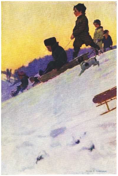 When they got back again to the top of the hill, Tommy’s father wanted to know if they had had enough, but Tommy told him he never could have enough. So they coasted down again and again, until at length his father thought they had better be going home, and Johnny said he had to go home, too, “to help his mother.”