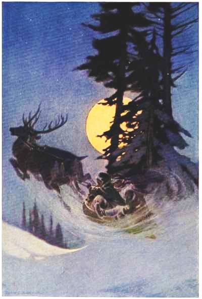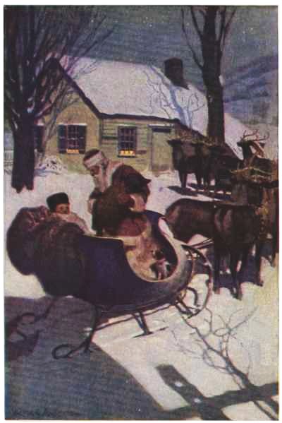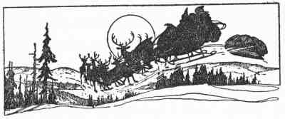Santa Claus gave Johnny a wink. “That boy is improving,” he said. “He knows some things;” and with that he took out of the case and gave both Tommy and Johnny big heavy coats of whitish fur and two bags made of skin. “And now,” he said, “you will have to be off if you want to 70 get back here before I leave, for though the night is very long, I must be getting away soon,” and all of a sudden the door opened and there was the North Star straight ahead, and at a whistle from Santa Claus away went the dogs, one sled right behind the other, and Sate, galloping for life and barking with joy, alongside.