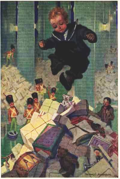 “I tell you,” said one, “the Governor will have a busy time to-night. It beats last Christmas.” And he made a run and a jump, and lit on a big pile of bundles which suddenly toppled over with him and nearly buried him as he sprawled on the slippery floor. This seemed a huge joke to all the others and they screamed with laughter at “Old Smartie,” as they called him, and poured more bundles down on him, just as though they were having a pillow-fight. Then when Old Smartie had at last gotten on his feet, they had a great game of tag among the piles and over them, and the first thing Tommy knew he and Johnny were at it as hard as anybody. He was very 50 proud because Johnny could jump over piles as high as the best of them. Tommy, himself, however, could not jump; for they led him to a pile so high that he could not see over it; and on top were the fragments of all the things he had ever had and had broken up. He could not help crying a little; but just then in dashed a number of little men and gathering them up, rushed out with them. Tommy was wondering what they were going to do with them, when his friend, the guard, said: “We mend some of them; and some we keep to remind you with. Now try again.” Tommy tried and did very well, only his left foot had gone to sleep in the sled and had not quite waked up.