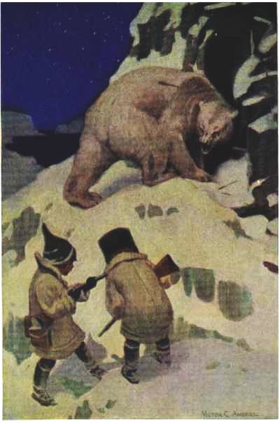 Carefully dividing the ammunition now, 86 both boys loaded their guns, and hurrying down the icy slope, carefully approached the mouth of the cave, guns in hand, in case the bear should appear.