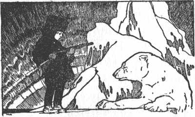 So they crept along until they reached 79 the foot of a high ridge of ice piled up below a long ledge of black rock which seemed to rise out of the frozen sea. Up this they worked their way, stooping low, the guide in front, clutching his bow and arrow, Johnny next, clutching his gun, and Tommy behind, clutching his, each treading in the other’s tracks. Suddenly, as he neared the top, the guide dropped flat on the snow. Johnny followed his example and Tommy did the same. They knew that they must be close to the bear and they held their breath; for the guide, having examined his bow and arrows carefully, began to wriggle along on his stomach. Johnny and Tommy wriggled along behind him, clutching their guns. Just at the top of the ledge the guide quietly slipped an arrow out of his quiver and held it in his hand, as he slowly raised his head and peeped over. Johnny and 80 Tommy, guns in hand, crept up beside him to peep also. At that instant, however, before Tommy could see anything, the guide sprang to his feet. “Whiz,” by Tommy’s ear went an arrow at a great white object towering above them at the entrance of what seemed a sort of cave, and two more arrows followed it, whizzing by his ear so quickly that they were all three sticking in deep before Tommy took in that the object was a great white polar bear, with his head turned from them, in the act of going in the cave. As the arrows struck him, he twisted himself and bit savagely at them, breaking off all but one, which was lodged back of his shoulder. As he reared up on his hind legs and tried to get at this arrow, he seemed to Tommy as high as the great wardrobe at home. Tommy, however, had no time to do much thinking, for in twisting 81 around the bear caught sight of them. As he turned toward them, the guide with a yell that sounded like “Look out!” dodged behind, but both Tommy and Johnny threw up their guns and pulled the trigger. What was their horror to find that they both had forgotten to load their guns after showing the guide how they could shoot. The next second, with jaws wide open, the bear made a dash for them. Tommy’s heart leapt into his throat. He glanced around to see if he could run and climb a tree, for he knew that grizzlies could not climb, and he hoped that polar bears could not climb either, while Tommy prided himself on climbing and had often climbed the apple-tree in the pasture at home; but there was not a tree or a shrub in sight, and all he saw was the little guide running for life and disappearing behind an ice-peak. 82
