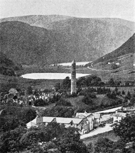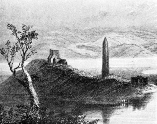 | Its weird situation—A good central point from which to make excursions—“Sugar-loaf” mountain; its horrible modern name, and grand ancient one—Glendaloch the most celebrated place in Wicklow—St Kevin; his youth; his piety; he did not drown Kathleen; he only whipped her with nettles—Kevin the most popular of Leinster Saints—“St Kevin’s bed”—Glendaloch an almost utter ruin—Ancient Irish monasteries; their great wealth—Antique gold ornaments—The evils of Danish raids—How well the Irish fought the Danes—Round towers—Their uses—Books destroyed by the Northmen—Halo of legend and romance that is round Glendaloch. | |
