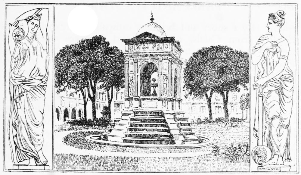 [146] It extended as far as the entrance to the quadrangle opposite the Pont des Arts. A double line of trees, north and south, enclosed a Renaissance garden of elaborate design, and a charming bosquet, or wood, filled the eastern extremity.