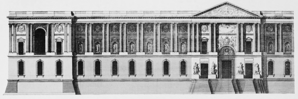 [142] Levau’s south façade was not completely hidden by Perrault’s screen, for the roofs of the end and central pavilions emerged from behind it until they were destroyed by Gabriel in 1755.