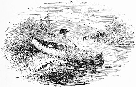 Here we were obliged to make a portage of three-fourths of a mile through the dense woods to the foot of the falls, and, in a heavy shower, went into camp on the opposite shore. To the “camper-out” a rainy day in the woods is among the most disagreeable experiences, even under a tight tent, with good company and plenty of amusement. But the difficulties increase by being forced to be out in the storm, and to leave your canoe at a portage and obliged to carry on your back through mud and mire all your camp effects.