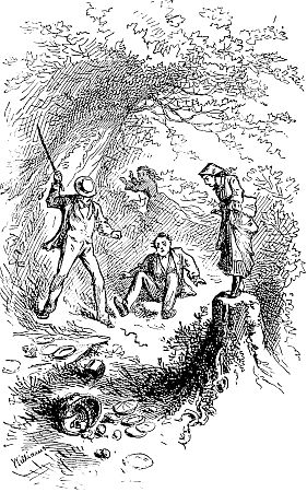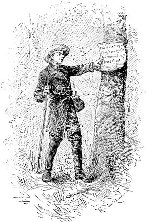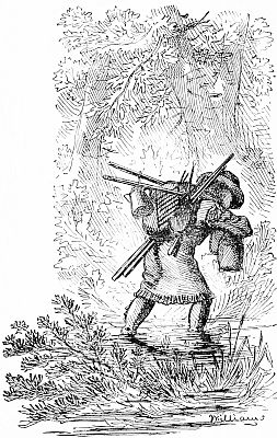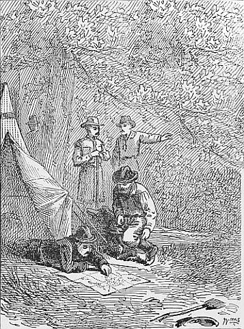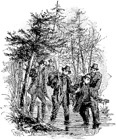 Through the woods you stumble, pressing the wet branches aside, which in their recoil push away your rubber clothing, from which the buttons are fast disappearing and the rents appearing, and whose special protection is sadly deficient, until the repetition of such circumstances as thoroughly drenches you as if you had [124] been without them. The water is dripping from off your hat to your neck and rolling down your back in icy rills. The position of your arms in carrying your “kit” is such as to lead a looker-on to imagine you are striving hard to fill your sleeves with the rain, which you know is a mistake, but there is no help for it. You clutch tightly to your rifle as your pack begins to slip, striving to keep the locks from the rain, while your boots have been innocently occupied in catching every scanty drop which fell from your clothing, and you have every appearance, if not the feeling, of the oft-quoted “drowned rat.” You would not have your wife, or other friend, see you at this moment for anything. How they would laugh, and hurl at you many of your pet quotations regarding the “poetry, pleasure, and romance of life in the woods,” until you had rather endure another storm than their irony.