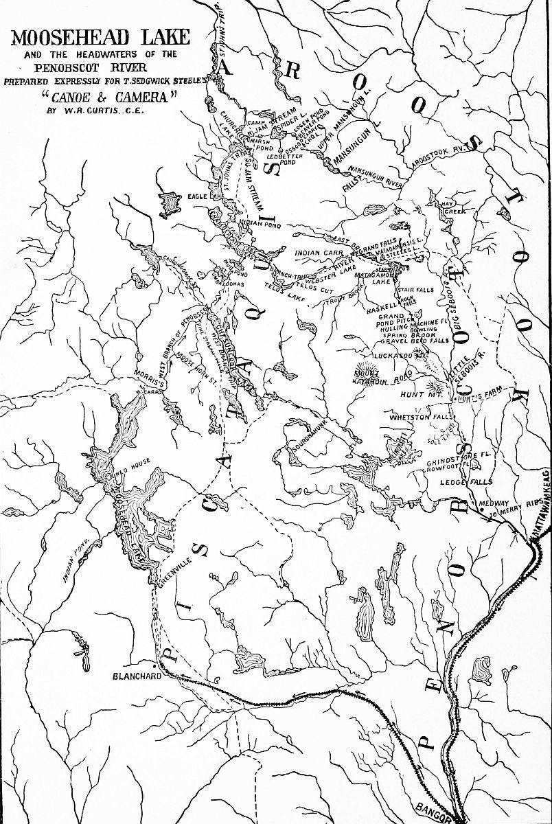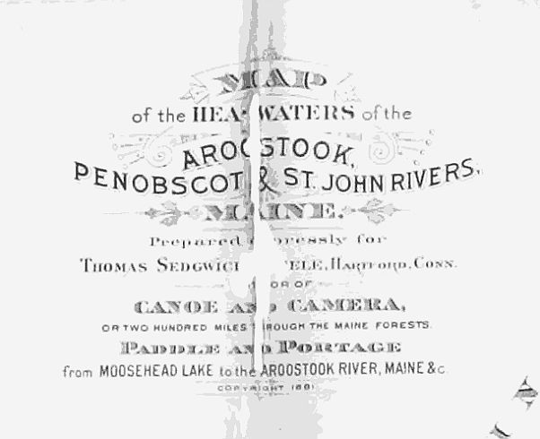 “A New Map of Northern Maine.—Mr. Thomas Sedgwick Steele, author of ‘Canoe and Camera’ and other works, has just compiled one of the most satisfactory maps of the great canoe tours of Northern Maine yet published. This chart is 20 × 30 inches, printed on Government Survey paper, mounted on cloth, and is an invaluable aid to the sportsman tourist in these wild regions,—in fact, to such an individual it is a most necessary adjunct to the economy of his camp kit. From the extreme lower portion of the map covered by Moosehead Lake diverge the great rivers of this vast wilderness,—the Main St. John, Aroostook, and East and West Branches of the Penobscot, while a portion of Canada on the north and New Brunswick on the east is embraced within its boundaries. Great care has been exercised in noting many points along these routes, which, although of the greatest importance to the canoeist, are seldom brought within the scope of the ordinary map. Along the Main St. John every log house and portage seems to be conscientiously indicated, while the many falls of the picturesque East Branch are noted, to the advantage and caution of the voyageur of these waters. After leaving the farms at Chesuncook and Chamberlin Lake the tourist to the Aroostook paddles about two hundred miles through the wilderness before reaching a sign of civilization, the first house being that of Philip Painter, while the second habitation, one mile further on, is that of William Botting, situated on the right bank, at a bend of the Aroostook River, called the Oxbow. Innumerable lakes and ponds are spread out before one on this chart like shot holes in a target. These and many other points of interest recommend this new survey of Mr. Steele to the camper-out in the wilds of Maine. The map is published by Estes & Lauriat, of Boston, and is mailed, post-paid, for $1.00 per copy.”—Forest and Stream.