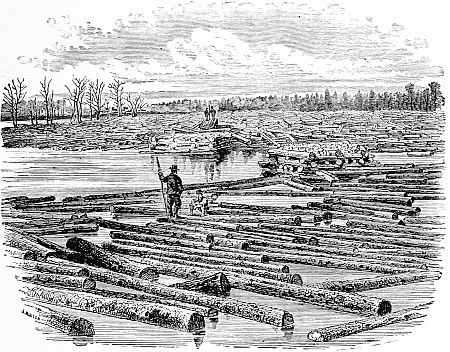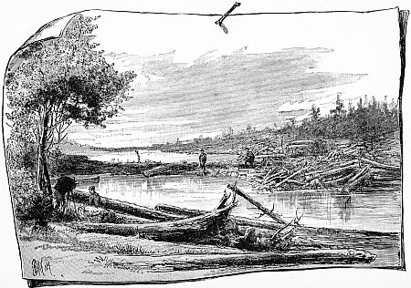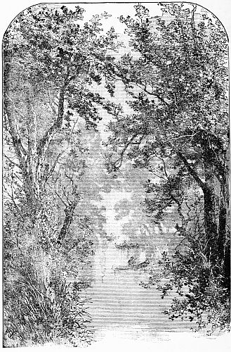 On turning a beautiful bend in the river, what was our surprise to observe the rugged growth of pines gradually disappear, and the landscape immediately softened by the introduction of a dense forest of maple, elm, ash, and noble oak trees, whose gnarled trunks pushed themselves far into the stream, their branches overlocking above our heads and forming a canopy that darkened the water.