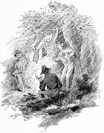 Two forked sticks with one across are placed before the fire, and on them you hang boots, socks, blankets, and other articles of your belongings, and, while the guides are cleaning your guns, you examine the provision boxes to see if they have escaped the drenching.