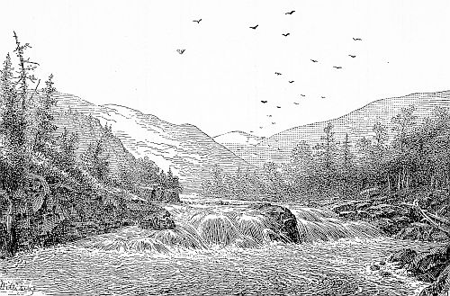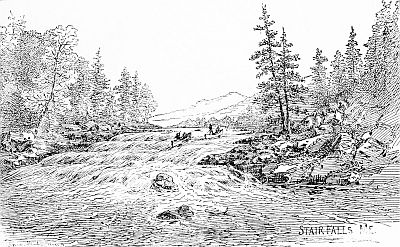 This fall or cascade is a series of steps or stairs some five in number, each about three feet high and ten feet apart, the best passage being through the channel near the left bank. It is a very choice bit of scenery, and one that any artist would greatly desire to transfer to canvas and work into endless variety of composition. A ten-mile passage of the swift river, and we reached Grand [122]falls, which, although higher than its namesake on Webster river, being followed immediately by numerous cataracts did not so impress one.