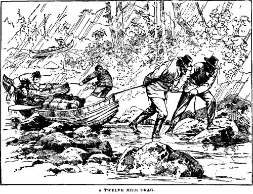 The current sweeps us swiftly onward through rapids innumerable in the full excitement of canoe life, but occasionally we are forced to disembark and drag our canoes over a rocky beach, which obliges us to retain the “shoes.”