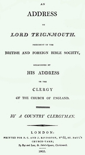 The emotions of my mind, upon receipt of your Lordship’s address as President of the British and Foreign Bible Society, were such as I am not inclined, for several reasons, to describe. Your friends represent you as not hostile to the established church: nay, some assert that you are its firm supporter; and doubtless it never could have entered your Lordship’s mind to address a clergyman with proposals of lending his zeal and exertions for the promotion of religion, but in the character of the church’s friend. Judge then, my Lord, at my surprize, to see your Lordship’s name at the head of such a list of subscribers as that enclosed to me; to find your Lordship’s patronage and protection bestowed upon every description of its enemies, and your request that I would promote their design. Judge, my Lord, what must have been my grief, to find a man of your Lordship’s respectability deserting the cause of sound religion, and our poor country’s best p. 4defence, and confederating with persons openly labouring the destruction of all that is sober, or established!