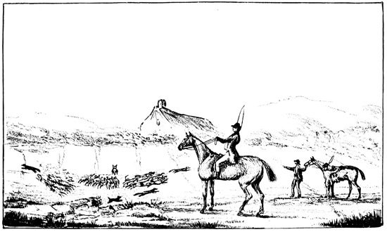 It is supposed that when people can fly thither by steam, it will become the Melton of the North; but I hope the idea will end, as it began, in smoke. You, my southern friends, appear to think that we do not go the very fast pace that you do, and that the hounds by which we are hunted are not equally as good as those in your country; but in this, too, you are much mistaken. So good is the scent there that, if it were not for the drains, which are now so general in the cultivated parts, the hounds, at the awful pace they go, would in a very short time kill nearly every one of us. Then the huntsmen are not to be despised; on the contrary, we have to contend with one who, with the following qualifications, is near perfection,—the eye of an eagle, fine temper, boldness, enterprise, coolness, perseverance, intelligence, and, above all, decision. This is the rare man with whom, and with whose pack, we have to contend. I am proud to say that I have been hunted by, and escaped from him, on a good scenting day too, by taking refuge in the crevice of a rock, after one of the fastest runs possible for five miles. It began thus:—One 104 morning early last season, when lying in a covert called Bushen Glen, I was startled by hearing a man riding quickly by. He then suddenly stopped and addressed these few words to the whipper-in, who brought the hounds.