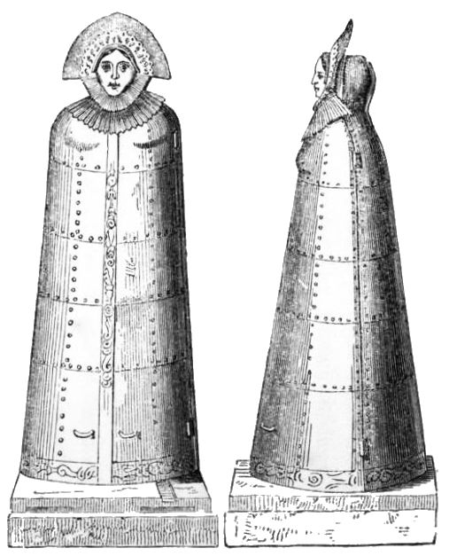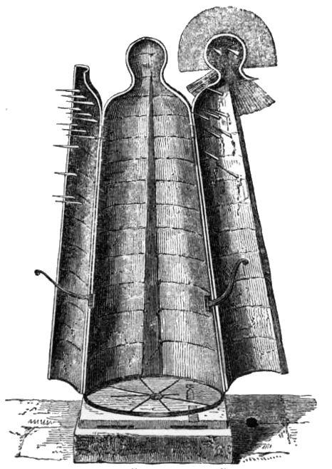 “The construction of the figure,” says Mr. Pearsall, “was simple enough. A skeleton, formed of bars and hoops, was coated over with sheet iron, which was laid on and painted, so as to represent a Nuremberg citizen’s wife of the sixteenth century. The front of the machine opened like folding doors, the two halves of the front part of it being connected by hinges with the back part. On the inside of its right breast are thirteen quadrangular poniards. There are eight of these on the inside of the left, and two on the inside of the face. These last were clearly intended for the eyes of the victim, who must have, therefore, gone backwards into it, and have received, in an upright position, in his breast and head, the blades to which he was exposed. That this machine had been formerly used cannot be doubted; because there are evident blood-stains yet visible on its breast, and on the upper part of its pedestal. How it was worked is not known, for the mechanism which caused it to open and shut is no longer attached to it; but that there was some such mechanism, is clear from the holes and sockets which have been cut out on the surface of the pedestal, showing the points where parts of the apparatus intended to work it must have been inserted. It stands, at present, on castors, and there{380} are two iron springs, which its present proprietor has caused to be placed in it, for the purpose of making its sides to open whenever it is moved forward; but this is done to startle, by way of pleasantry, those who see it for the first time.”