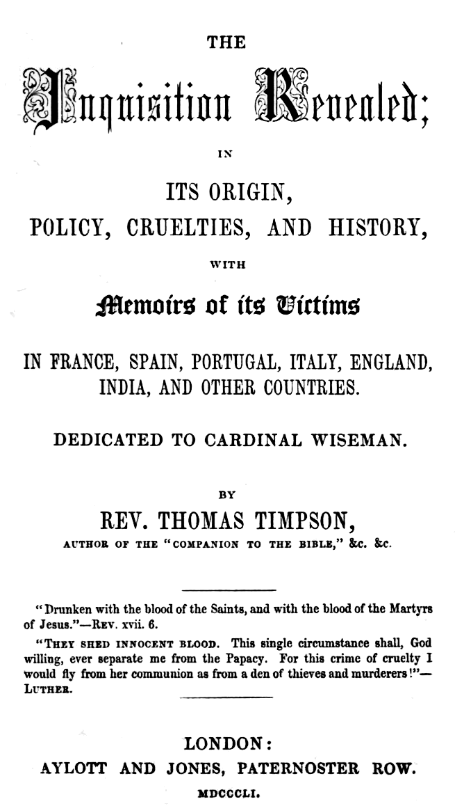Cardinal Wiseman having attempted a vindication of the Inquisition, Dr. Achilli notices his jesuitical effort; and he asks, “What, then, is the Inquisition of the nineteenth century? The same system of{339} intolerance which prevailed in the barbarous ages. That which raised the Crusade, and roused all Europe to arms at the voice of a monk [Bernard] and of a hermit [Peter]. That which—in the name of a God of peace, manifested on earth by Christ, who, through love for sinners, gave himself to be crucified—brought slaughter on the Albigenses; filled France with desolation, under Domenico di Gusman; raised in Spain the funeral pile and the scaffold, devastating the fair kingdoms of Granada and Castile, through the assistance of those detestable monks, Raimond de Pennefort, Peter Arbues, and Cardinal Torquemada. That which, to its eternal infamy, registers in the annals of France the fatal 24th of August, and the 5th of November in those of England. That same system which at this moment flourishes in Rome, which has never yet been either worn out or modified, and which, at this present time, in the jargon of the priests, is called, ‘The Holy, Roman, Universal, Apostolic Inquisition!’ Holy, as the place where Christ was crucified is holy; Apostolic, because Judas Iscariot was the first inquisitor; Roman and Universal, because from Rome it extends over all the world.