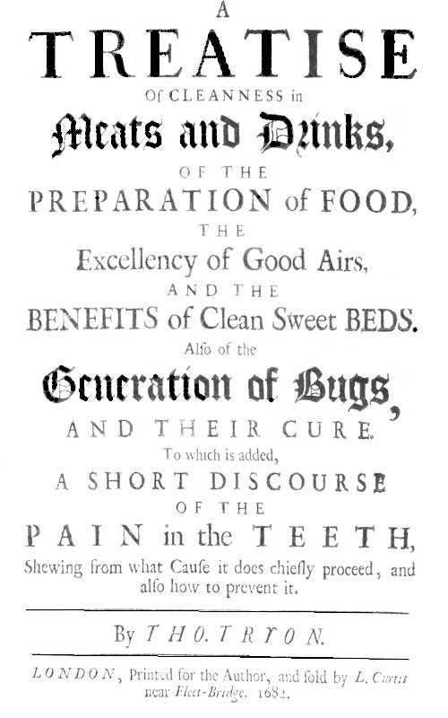 1Of Cleanness in Meats and Drinks. Of the Excellency of Good Airs, and of the contrary. Of the Benefits of Clean Sweet Beds, and of the Inconveniences of Feather-Beds. What Matter it is that does occasion the Generation of that pernicious Vermin called Bugs, that so many Hundreds in this City, and other great Towns, are infested with; more especially in Holland, Italy, New-England, Barbadoes, Jamaica, and in many other Places. That they are never bred but where Beds are: And that their being generated from Wooden Bedsteads, or from Hogs Hair in the Plaisterings of the Walls, is a meer Story, promoted inconsiderately by Persons mistaken in the Productions of Nature: Also, How all such Persons as are troubled with them may be cured without using Medicines, and Directions how to avoid ever having them again.