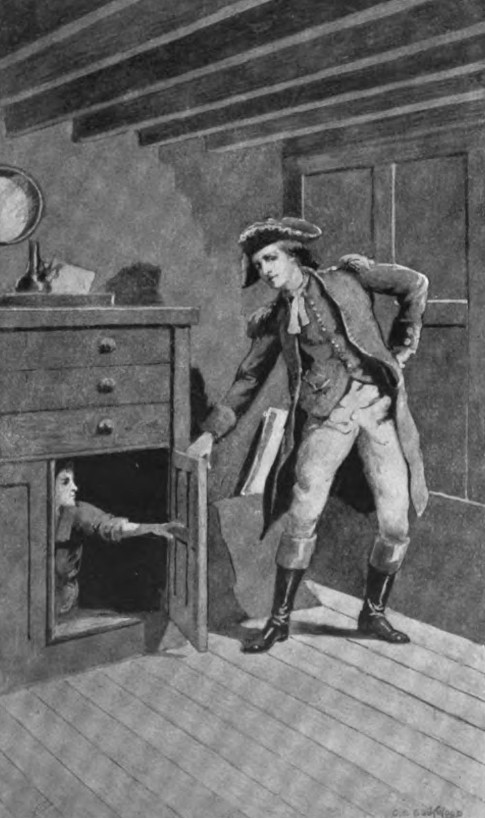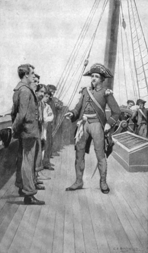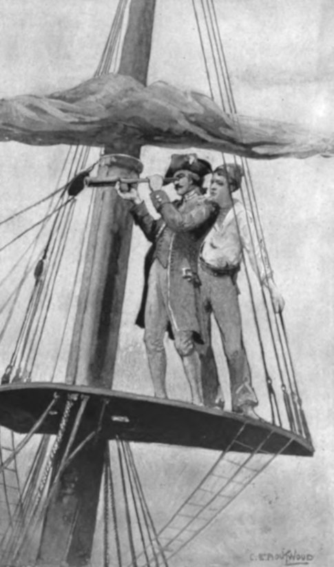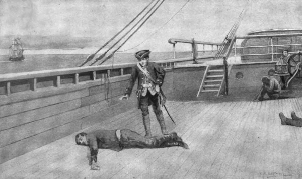 "We didn't go back to Baltimore," said Johnson, "but put into Newport when the forty-five days were up. We stayed there about ten days, refitting and recruiting our crew, and then started out again. Two days out from Newport we were chased by three British men-of-war all at once; but our sailing qualities came into play and we got away from all of them. A day or two later we were chased by an English frigate for six hours, but left her behind us at last. We captured a British armed packet, the Princess Amelia, and had a very savage fight with her for almost an hour at pistol-shot distance all the time. Mr. Long, our first lieutenant, was severely wounded, and six of the crew were injured, but not very badly. The Princess Amelia lost her captain, sailing-master, and one sailor, killed, and the master's mate and six seamen were wounded.