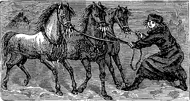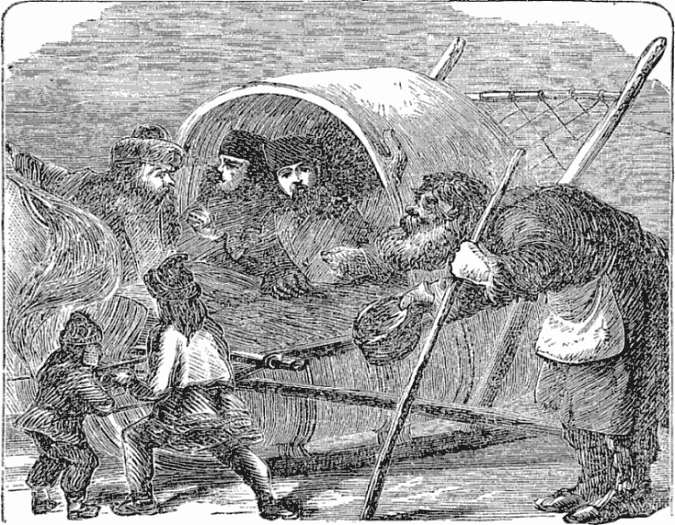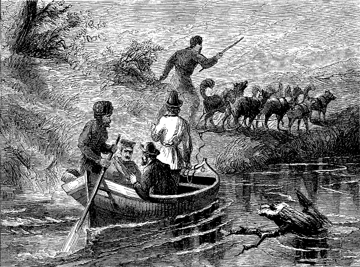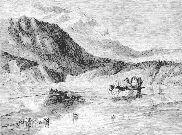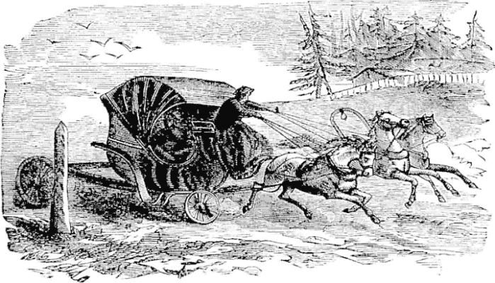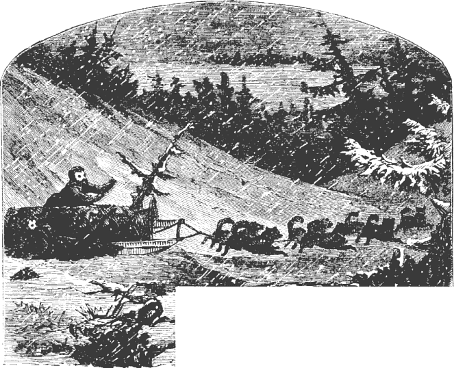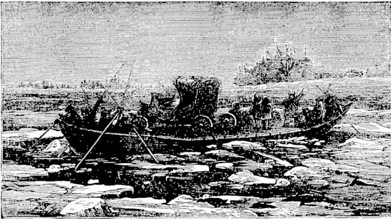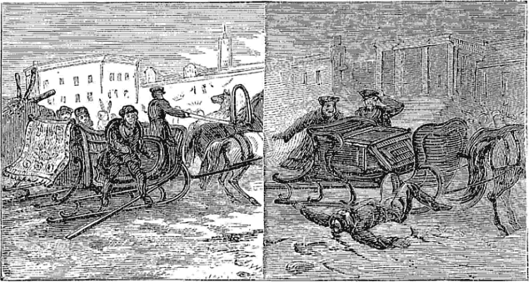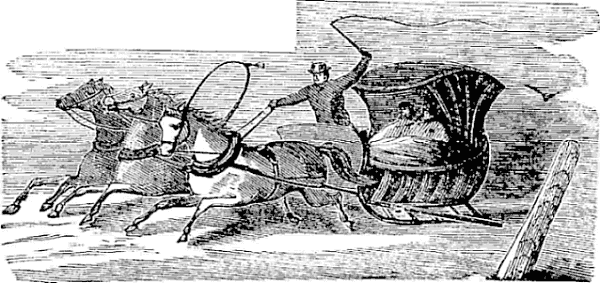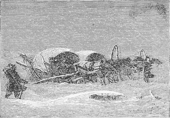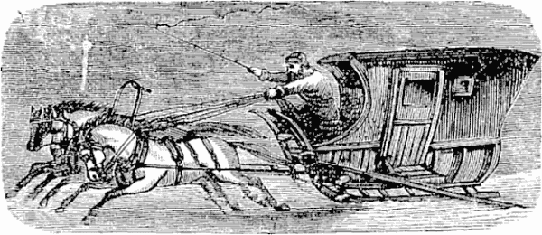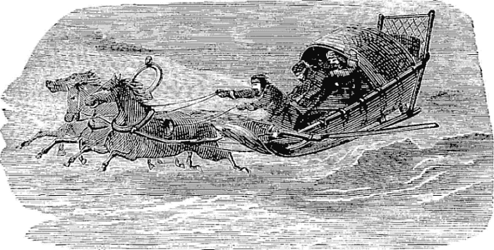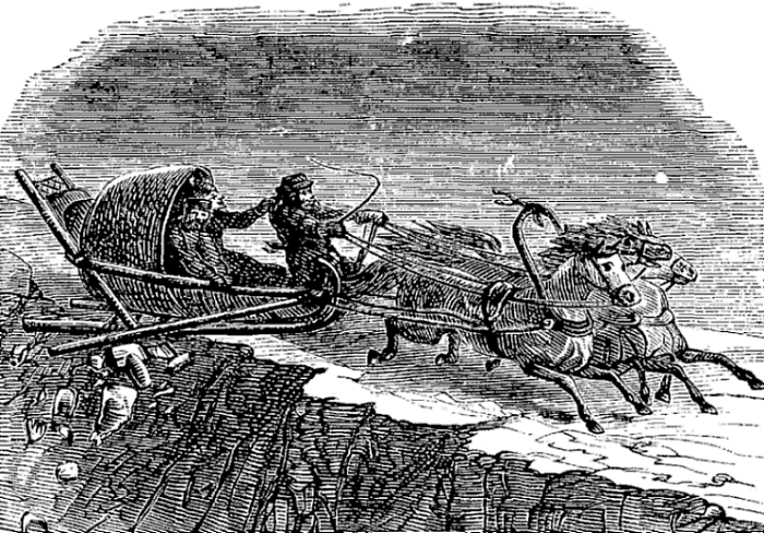 Night came upon us soon after passing the first station. The road was a combination of pitch-holes, water, soft snow, and detours to avoid dangerous places. The most unpleasant drives were when we left the river to change horses at the villages on the high bank. It was well enough going up, but in descending the sleigh sometimes endeavored to go ahead of the horses. Once we came near going over a perpendicular bank sixty or eighty feet high. Had we done so, our establishment would have not been worth fifty cents a bushel at the bottom of the bank.