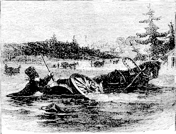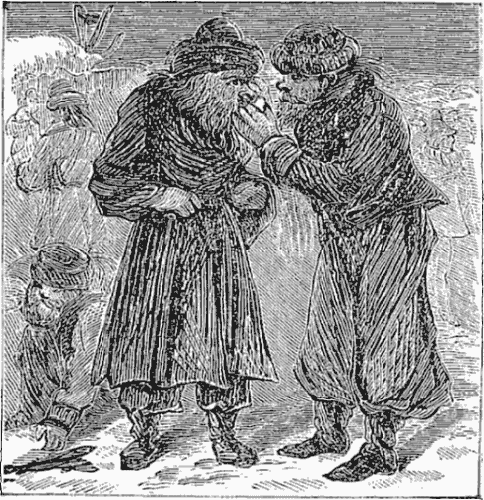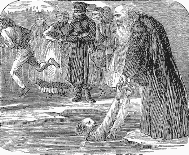 About fifty versts from Nijne Novgorod the population of a large village was gathered, in Sunday dress, upon the ice. A baptism was in progress, and as we drove past the assemblage we caught a glimpse of a man plunging through a freshly cut hole. Half a minute later he emerged from the crowd and ran toward the nearest house, the water dripping from his garments and hair. As we passed around the end of the village, I looked back and saw another person running in the same direction.