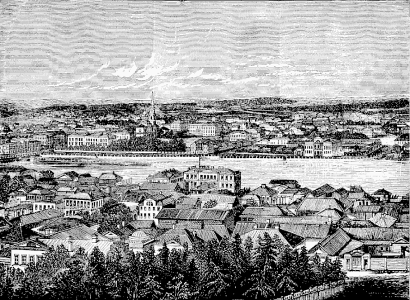 Nicholas called Kazan the third capital of his empire, and the city is generally admitted first in importance after St. Petersburg and Moscow. Its position is well chosen on the banks of a small river, the Kazanka, which joins the Volga six versts away. On a high bluff stretching into a plateau in the rear of the city and frowning defiantly toward the west, its position is a commanding one. On the edge of this bluff is the Kremlin, with its thick and high walls enclosing the governor’s palace and other public buildings, all overlooked by a lofty bell-tower. Every part of the city gives evidence of wealth.