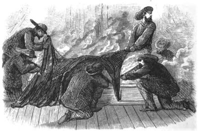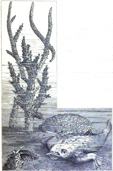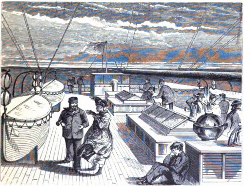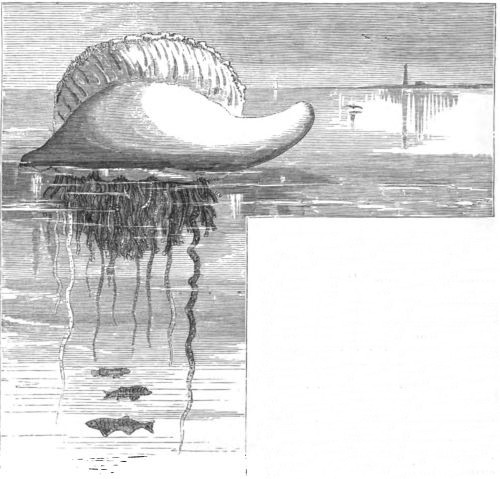 Flying-fish were numerous, and so were those curious denizens of the deep popularly known as "Portuguese men-of-war." One of the latter was caught by means of a bucket; a verdant passenger who admired its beautiful colors took it in his hand for a careful examination, but on feeling a stinging sensation he dropped it immediately. Doctor Bronson consoled him with the information that the scientific name of the Portuguese man-of-war is Physalis pelagica, and its power of stinging enables it to benumb its prey. It consists principally of an air-sac which floats it upon the water, and has long tentacles hanging down at various lengths. These tentacles are armed with stings; they paralyze any small fish that comes within their reach, and then act as fingers to sweep up the prize. It is a favorite trick of sailors to induce a novice to pick up a captured physalia, so that they may enjoy his haste in dropping it.