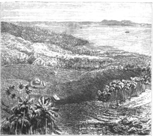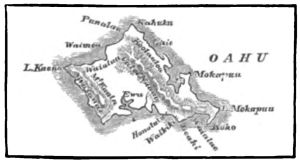 As the Alameda continued her course the outline of the land grew more and more distinct, revealing the rugged volcanic cliffs of Oahu, and reminding the passengers of the burning mountains for which the Sandwich Islands are famous. The course of the vessel lay through the Molokai Channel, leaving Molokai Island on the left, and hugging closely against the surf-beaten shores of Oahu, on which the capital, Honolulu, is situated. Near the water there were occasional groves of cocoanut-trees; but on the whole the shore was less tropical in appearance than our young friends had expected to find it.