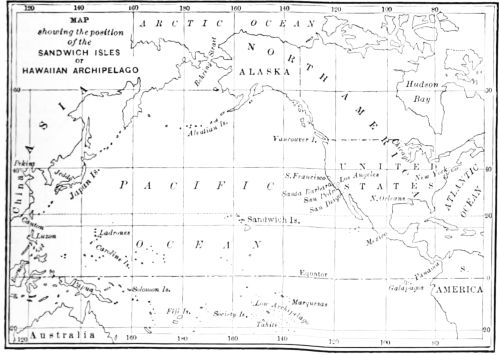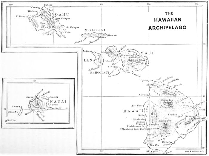 | CHAPTER I. | From San Francisco to Honolulu.—Sights on the Pacific Ocean.—A Portuguese Man-of-war.—Nearing the Sandwich Islands.—The Molokai Channel.—Surf-beaten Shores of Oahu.—Arrival at Honolulu.—A Picturesque Port.—Discovery and History of the Sandwich Islands.—Captain Cook: his Tragic Death.—How the People have been Civilized.—Work of the Missionaries.—Schools and Churches.—Present Condition of the Population.—Old Customs.—Sights and Scenes in Honolulu.—Taro and Poi.—A Native Dinner.—The Costumes of the Islanders.—Peculiarities of the Climate.—The Hula-hula and other Dances. |