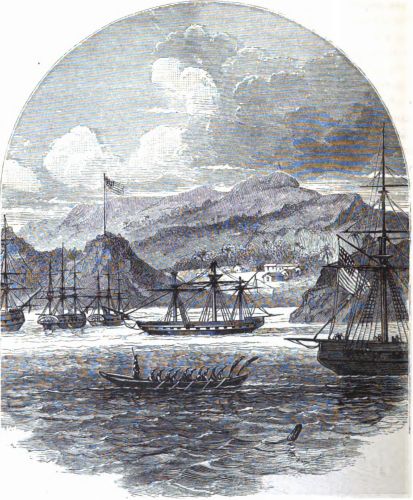 Every eye was straining to catch a view of Honolulu; but when its position was pointed out most of the passengers were unable to discover any marked indications of the presence of a town. After a time the steamer made a sharp turn to the starboard, and passed through the narrow channel which leads into the pretty harbor of Honolulu. Then the town appeared rather suddenly in view; its houses surrounded by groves of palms and tamarind-trees, interspersed with other tropical[Pg 4] growths in rich profusion. The harbor is a deep basin in a coral reef, and so perfectly landlocked that it is ordinarily as smooth as a mill-pond, and is safe in all winds that blow. There is good anchorage for ships, and when the Alameda entered there was a fleet of sufficient size in the port to give it a very prosperous appearance. Numerous small boats were darting about, and almost before the engines were stopped the little craft swarmed in great force about the steamer.