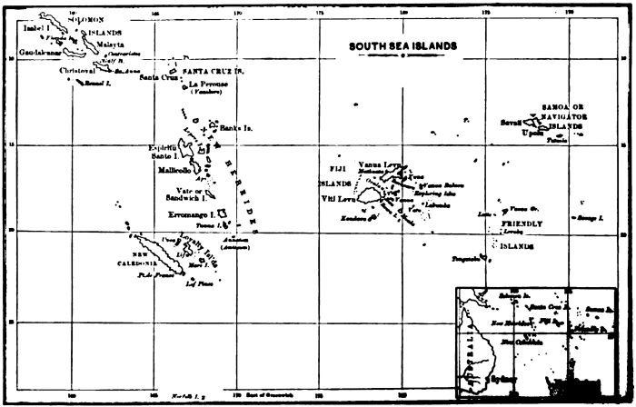 | CHAPTER VI. | The Samoan Islands.—Apia.—Its Position and Peculiarities.—Beach-combers.—History and Adventures of some of them.—Charley Savage.—Samoan Politics.—Attempt to Poison Missionaries.—French Convent and Schools.—Commerce with Samoa.—Visiting a Native Village.—Games of the Young People.—Youths Throwing Spears.—Mission College at Malua.—How the Students Live.—Pango-Pango.—Admiral Wilkes's Description.—Attending a Samoan Picnic.—Differences of Taste.—Massacre Bay.—La Pérouse.—How his Fate was Discovered.—The Sword-hilt at Tucopia.—Loss of the "Boussole" and "Astrolabe."—Vanikoro Island. |