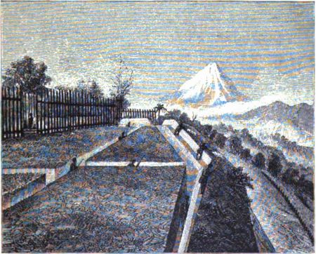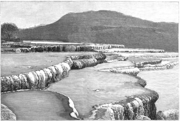 [7] Shortly after the visit described above, the famous terraces were destroyed by an eruption of Mount Tarawera. Soon after midnight of June 10, 1886, loud explosions were heard and violent earthquakes felt; in a few minutes Mount Tarawera broke out as an active volcano, hurling ashes, dust, and red-hot stones to a great height, and the whole sky in all directions seemed to be aflame. The ashes, dust, and mud were distributed over a wide area of country, some of the dust and ashes falling fifty miles away. The outbreak of Tarawera was followed almost immediately by a terrific outburst at Lake Rotomahana; the water of the lake, with its clay bed and the material of the Pink and White Terraces, was suddenly blown into the air in the shape of an immense mud-cloud followed by steam and smoke. The mud-cloud in its descent buried the surrounding country to various depths, ranging as high as thirty feet. The native villages of Wairoa and Te Ariki were completely covered, and the village of Mourea was bodily thrown into Lake Tarawera and swallowed out of sight. Over one hundred persons perished, the most of them natives. Mr. Hazard, the master of the native school at Wairoa, and four of his children were among the killed.