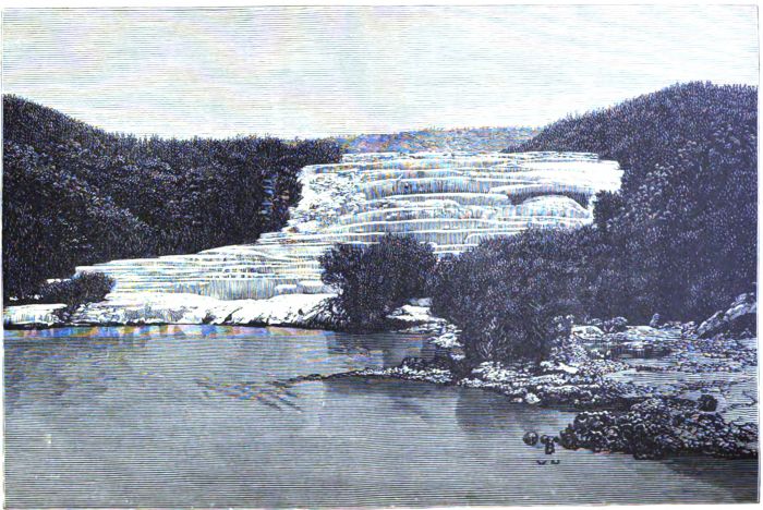 | CHAPTER X. | The Hot Lake District: its Extent and Peculiarities.—Medicinal Springs.—Analysis of the Waters.—Fred's Narrow Escape.—Scalded to Death in a Hot Pool.—Lake Rotomahana.—The White Terraces: how they are Formed.—The Pink Terraces.—Boiling Lakes.—Nature's Bath-tubs.—Petrified Birds.—A Tabooed Mountain.—The Tabu on Ducks.—Native Demoralization.—Wairoa.—Destruction of the Terraces.—Terrible Eruption, with Loss or Life.—A Village thrown into a Lake.—Tauranga and the Gate Pah.—Maori Fortifications.—Short History of the Maori War: its Causes and Results.—From Tauranga to Napier.—A Pastoral Country.—Attractions of Napier.—Overland to Wellington.—Farming and Herding Scenes.—A Curious Article of Commerce. |
