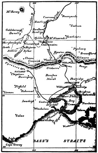 | CHAPTER XXI. | The Race for the Melbourne Cup.—Popularity of Horse-racing in Australia.—Cricket and other Sports.—Summer Retreats among the Mountains overlooking Melbourne.—"A Southerly Burster:" its Peculiarities.—Rapid Fall of the Thermometer.—Flooding the Streets of Melbourne.—Children Drowned in the Gutters.—Ballarat and the Gold-mines.—History of the Discovery of Gold in Australia.—The Rush to Ballarat and Bendigo.—Sandhurst: its Present Appearance.—Remarkable Yield of the Ballarat Mines.—"The Welcome Nugget."—Western District of Victoria.—Lake Scenery.—Australia's Potato-field.—Gippsland.—From Melbourne to Tasmania.—Launceston.—A Chapter of Tasmanian History.—Memories of Convict Days.—Corra Linn and other Show-places. |
