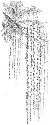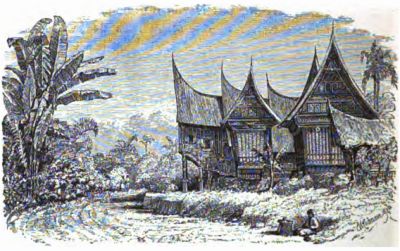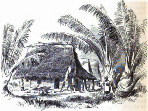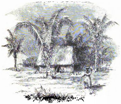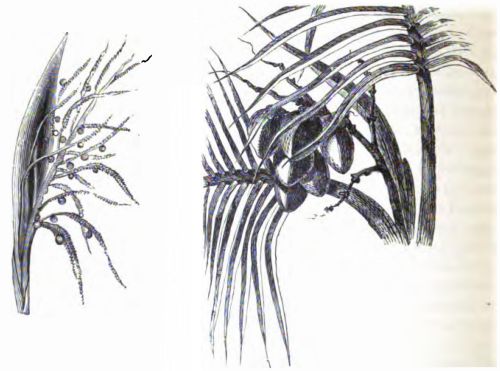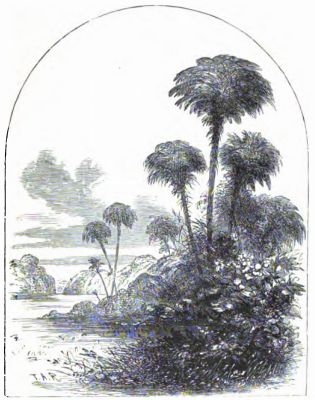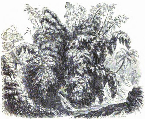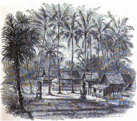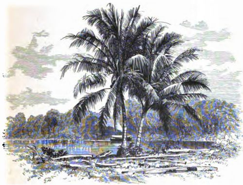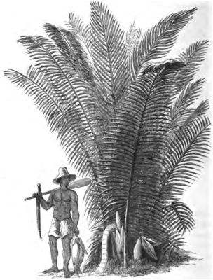 "The sago-tree belongs to the palm family; it is thicker and larger than the cocoa-palm, but not so tall, and its leaves are very large and long. The stem of the leaf is twelve or fifteen feet long, and six inches in diameter at the butt, and is used for a great many purposes. Whole houses are built of these stems, from the framework to the thatch-poles and flooring, and they never shrink or bend, or require any paint or varnish. The leaf forms an admirable thatch, and the trunk of the tree is the food of many thousands of people.